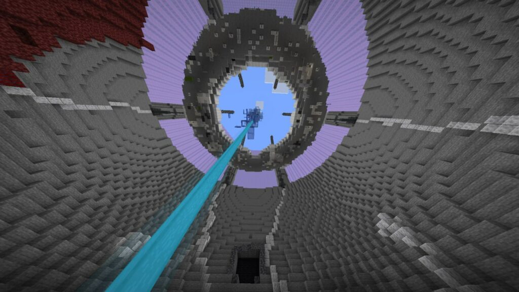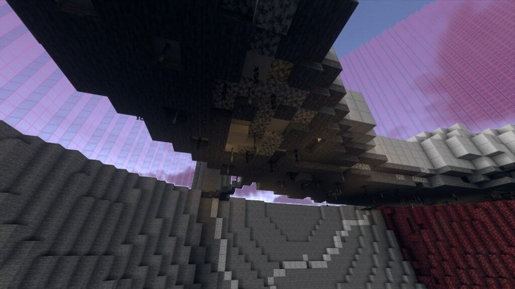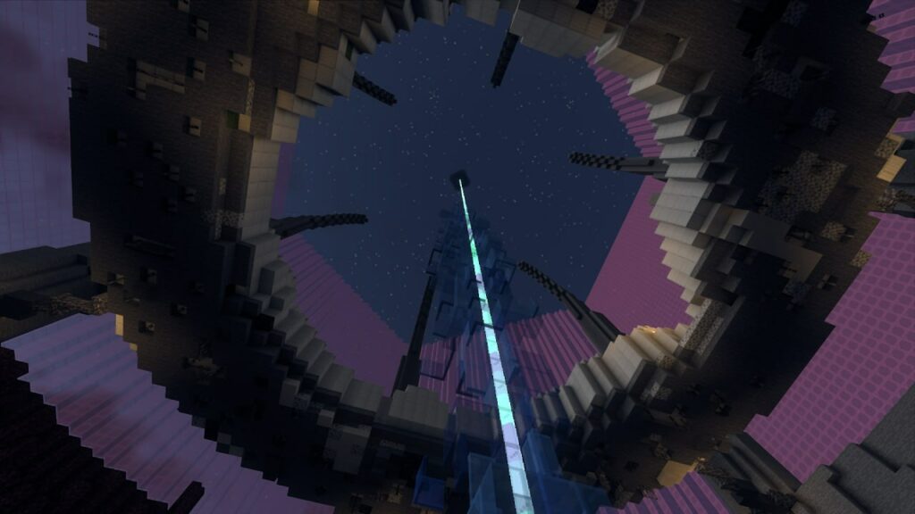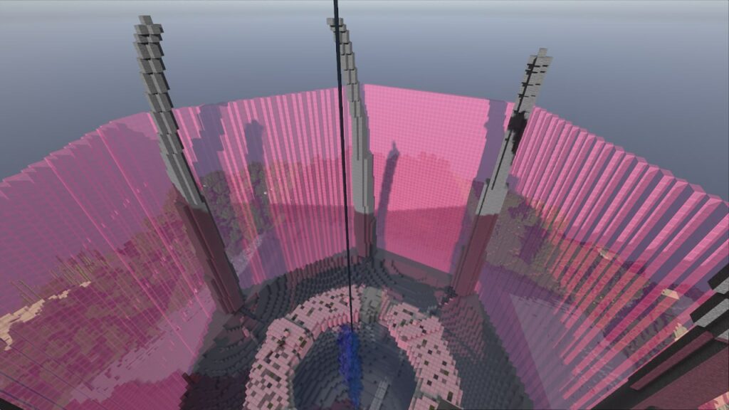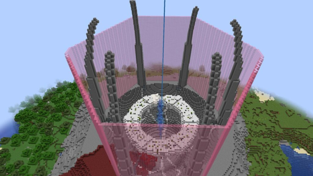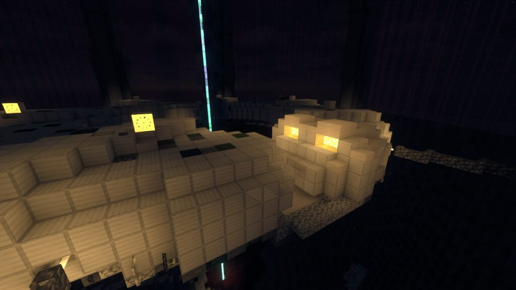 Построили мы логово Пожирателя Душ из Горизонтов. Изначально планировалось построить Блекджек с левитирующей катаной но подумали что это будет неоригинально ,а Пожиратель душ будет лучшим вариантом для этого. В постройку входят: кратер, в основном из незерака и камня; барьер из розового стекла и шпили из камня поддерживающие его; кольцо из железных блоков являющееся Пожирателем; колонна душ в центре кольца, из стекла; и Том из льда который скоро упадет на это все(почти). Размер постройки приблизительно 1\5 к книжке. Для получения основных ресурсов использовали ферму големов и наши лапки. (А еще на кольце есть терминалы возле которых бегает Блекджек)).